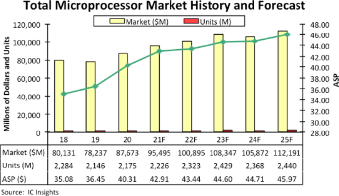 集微网消息,IC Insights最近发布了2021年版的《麦克林报告》(The McClean Report),对2020年整个微处理器(MPU)市场做了总结,并展望了未来五年的市场销售状况。