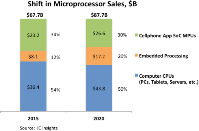 在过去的五年中,增长最快的微处理器市场类别是嵌入式处理器,在2015年至2020年之间销售额增长了114%。上图显示了计算机CPU处理器(按美元计算是最大的MPU类别)的销售额在最近五个年度中增长了20%。手机应用处理器的收入在2015年至2020年之间仅增长了15%,这是由于过去十年下半年智能手机业务日趋饱和所致。