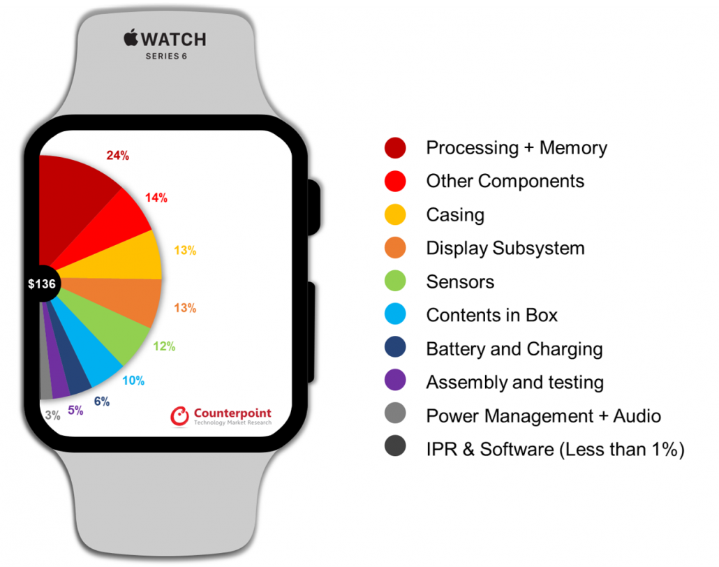 Counterpoint Research 在一份物料清单(BoM)报告中计算得知,仅应用处理器、显示屏、传感器和外壳的成本就约占 Apple Watch Series 6 总成本的 68%。Apple Watch Series 6 采用常显 Retina LTPO OLED 显示屏,提供 1000 尼特的峰值亮度。但由于该公司在该型号中取消了 Force Touch 功能,所以整体的 BoM 有所下降。