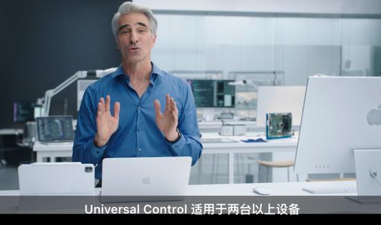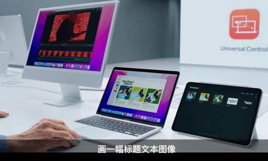 苹果推出的Universalcontrol功能可以让设备之间的协同更加快捷。在直播演示中,将iPad置于Mac旁,两设备即可相互连接,iPad可以充当Mac的副屏,同时Mac也可以通过键盘来直接控制iPad,进行文件的拖拽和处理。除了iPad与Mac,iMac也能通过外置键鼠达到相同的功能。苹果家族的设备协同生态达到了全新的高度。
