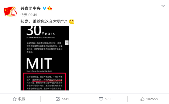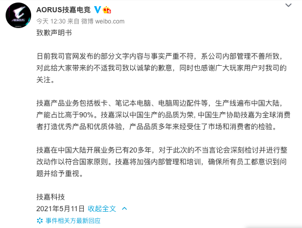 今日上午,共青团中央通过官方微博转载其官网截图并点名批评技嘉,称“技嘉,谁给你这么大勇气?”直到午间,技嘉方面通过官方微博发布致歉声明,称官网发布的部分文字内容与事实严重不符,并称这是公司内部管理不善所致,将对不当言论进行彻底审查,加强内部管理和培训,确保所有员工都意识到问题并给予重视。